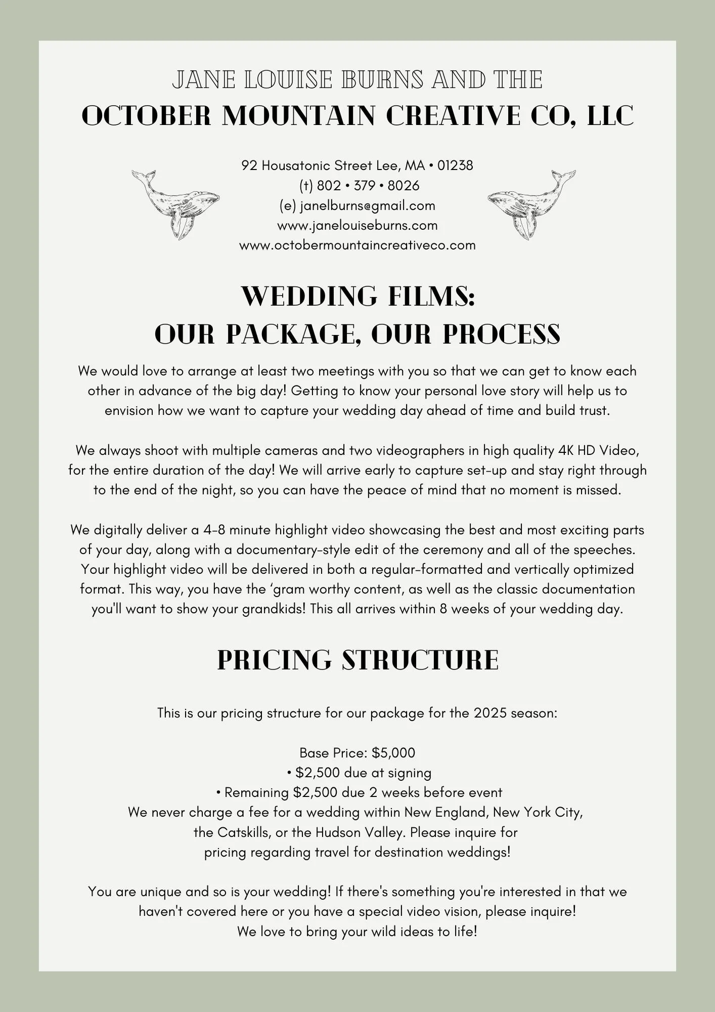 our 2025 wedding package starts at $5,000. please submit a wedding date inquiry for more information and to check our availability.